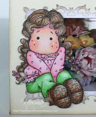 This sweet looking gal is called Tilda With Lovely Lace Shoes from Magnolia's Sweet Crazy Love Collection 2012. I've used my Letraset Promarkers and Trias markers to colour the images for this project.