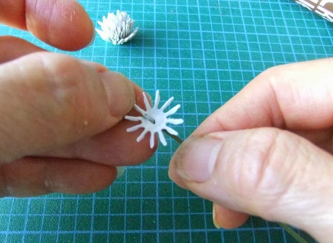 Dab some glue at the centre of the small flower and insert the green strip through the hole from underneath as shown.